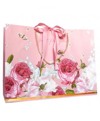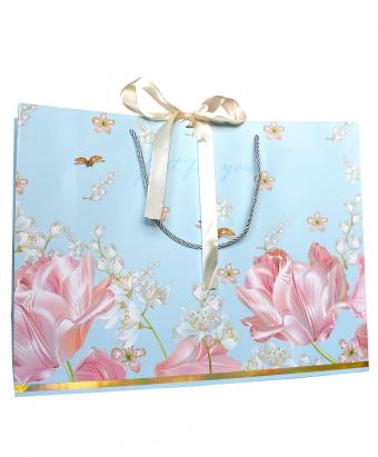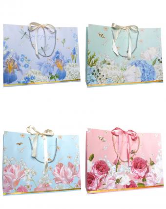 Горизонтальные бумажные подарочные пакеты из плотной матовой бумаги с рисунком и лентами, серия "Букет", размер 43*32*14 см.