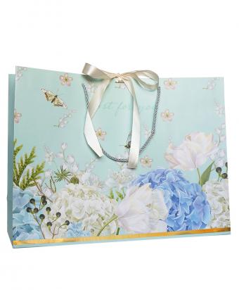 Бумажные горизонтальные подарочные пакеты-сумки из плотной матовой бумаги с рисунком и атласными лентами для завязывания пакета, серия "Букет".