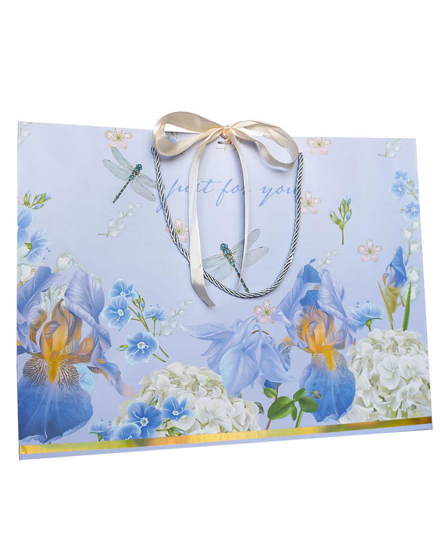 Бумажные горизонтальные подарочные пакеты-сумки из плотной матовой бумаги с рисунком и атласными лентами для завязывания пакета, серия "Букет".