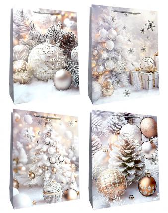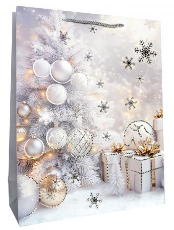 Бумажные новогодние подарочные пакеты из плотной матовой бумаги с серебряным тиснением, серия "Украшения блеск", размер 30*40*12 см.