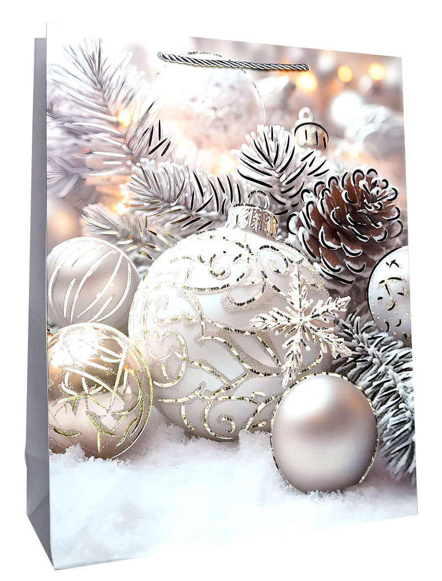 Бумажные новогодние подарочные пакеты из плотной матовой бумаги с серебряным тиснением, серия "Украшения блеск", размер 30*40*12 см.