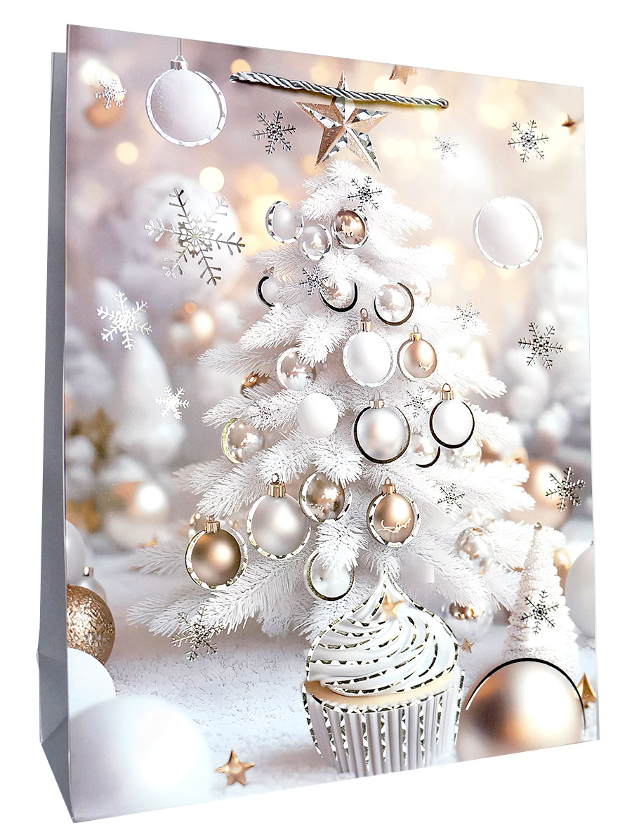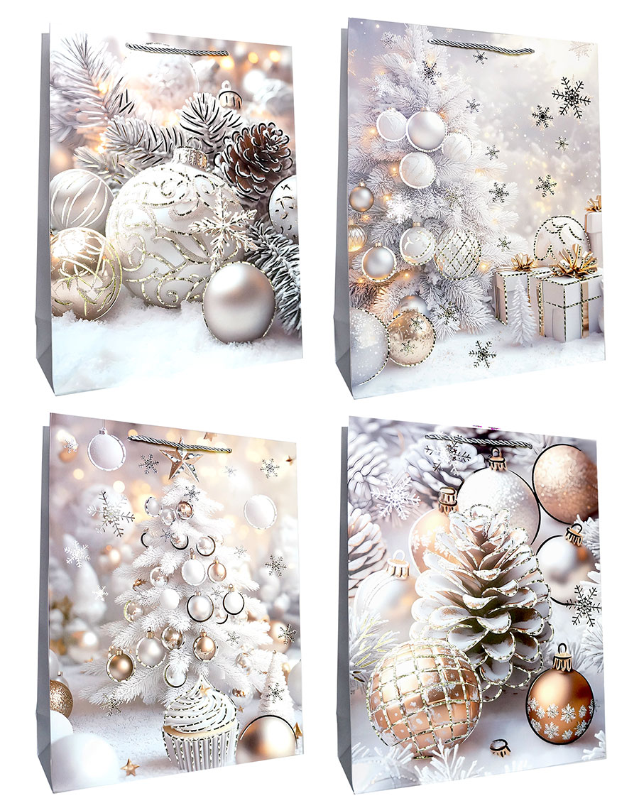 Новогодние бумажные подарочные пакеты-сумки из плотной матовой бумаги с рисунком и серебряным тиснением, серия "Украшения блеск".