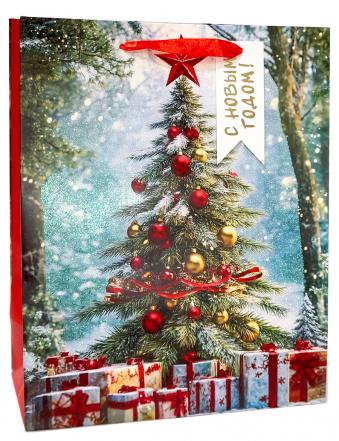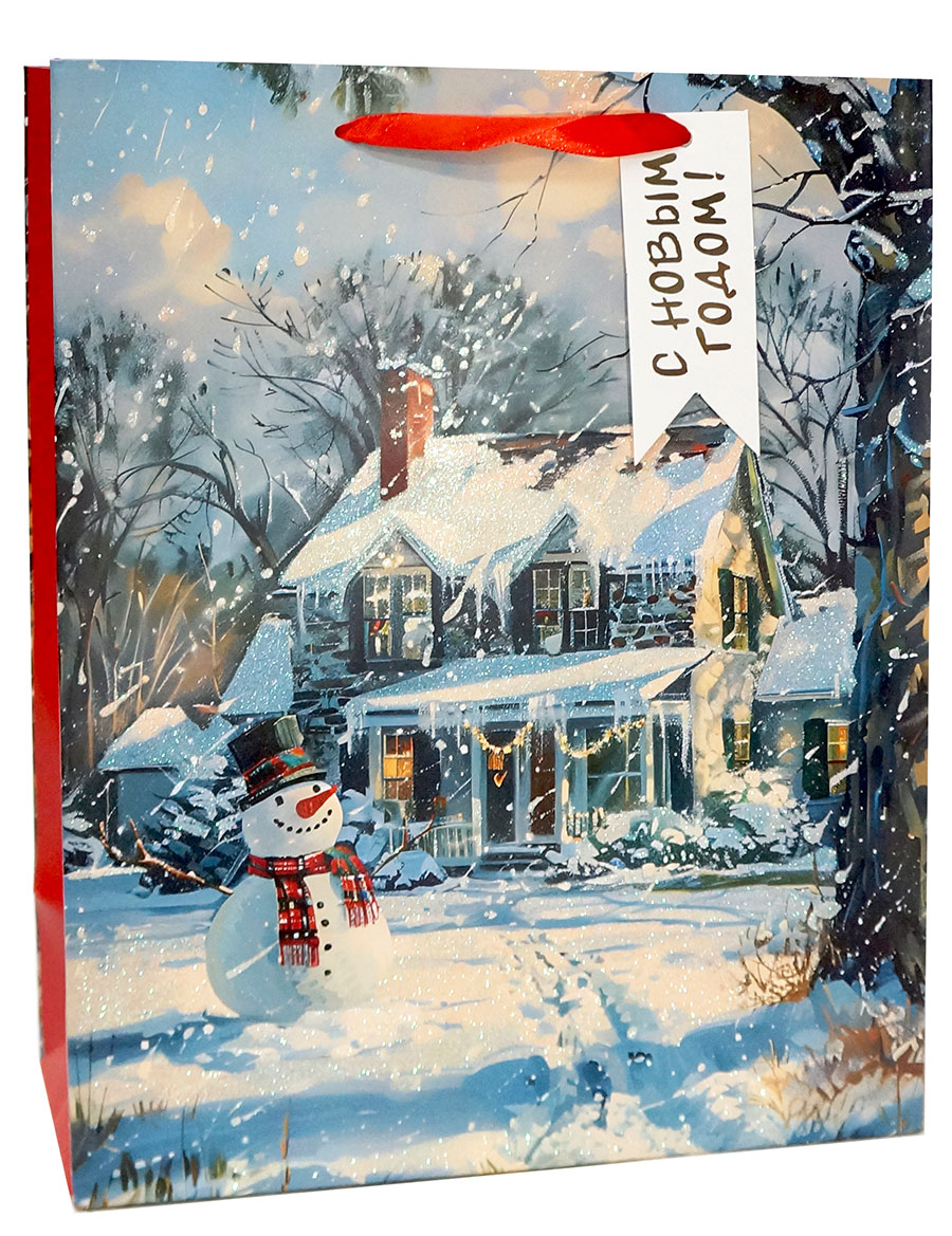 Бумажные новогодние подарочные пакеты из плотной матовой бумаги с красными блёстками, серия "Снежный уют", размер 26*32*12 см.