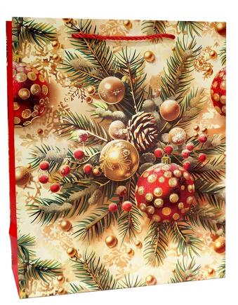Бумажные новогодние подарочные пакеты из плотной матовой бумаги с золотым тиснением, серия "Праздничное настроение", размер 31*42*12 см.