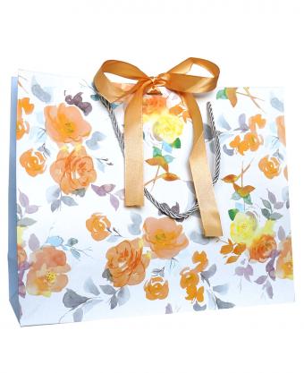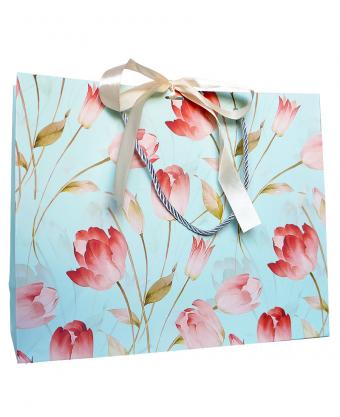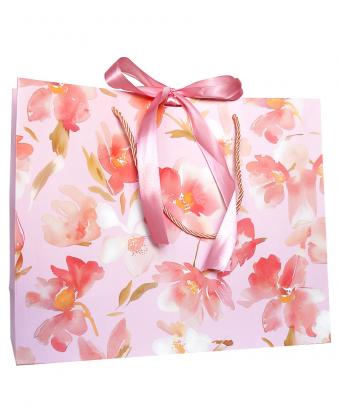 Горизонтальные бумажные подарочные пакеты из плотной матовой бумаги с рисунком и лентами, серия "Полевые цветы", размер 32*26*11 см.