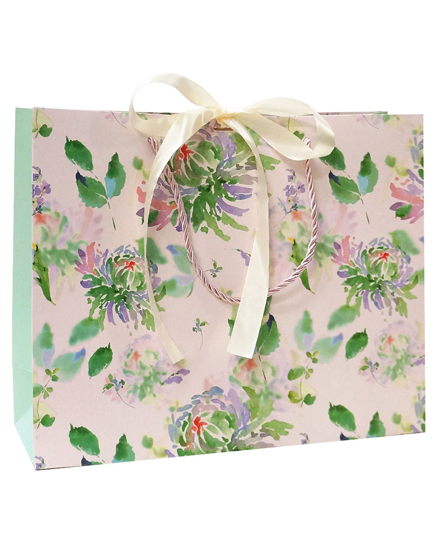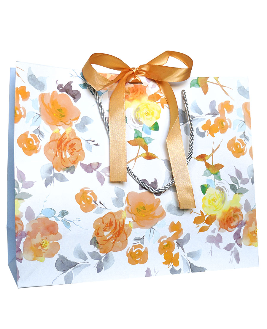 Бумажные горизонтальные подарочные пакеты-сумки из плотной матовой бумаги с рисунком и атласными лентами для завязывания пакета, серия "Полевые цветы".