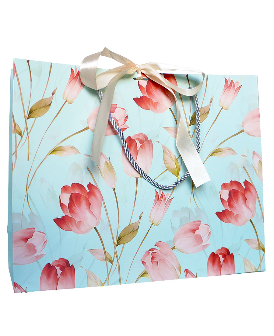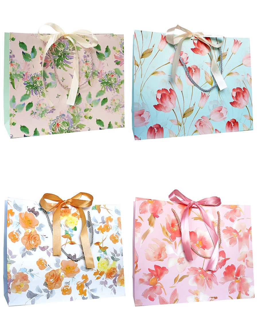 Горизонтальные бумажные подарочные пакеты из плотной матовой бумаги с рисунком и лентами, серия "Полевые цветы", размер 32*26*11 см.