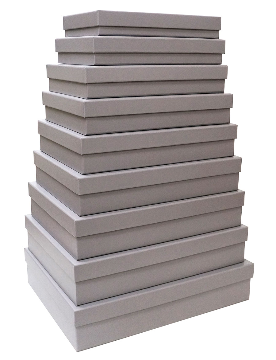 Набор из девяти плоских однотонных прямоугольных подарочных коробок, цвет серый кашемир. Коробки изготовлены из плотного картона, отделка подарочных коробок выполнена матовой бумагой.