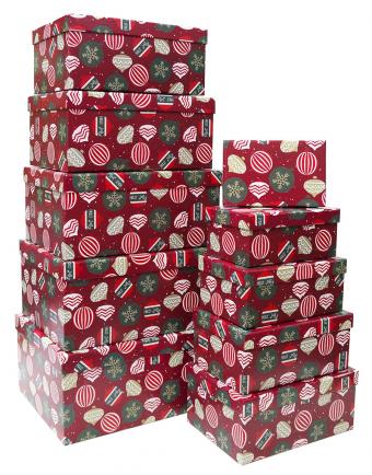 Набор из десяти новогодних прямоугольных подарочных коробок, расцветка "Игрушки на бордовом фоне". Коробки изготовлены из плотного картона, отделка подарочных коробок выполнена матовой бумагой с новогодним рисунком.