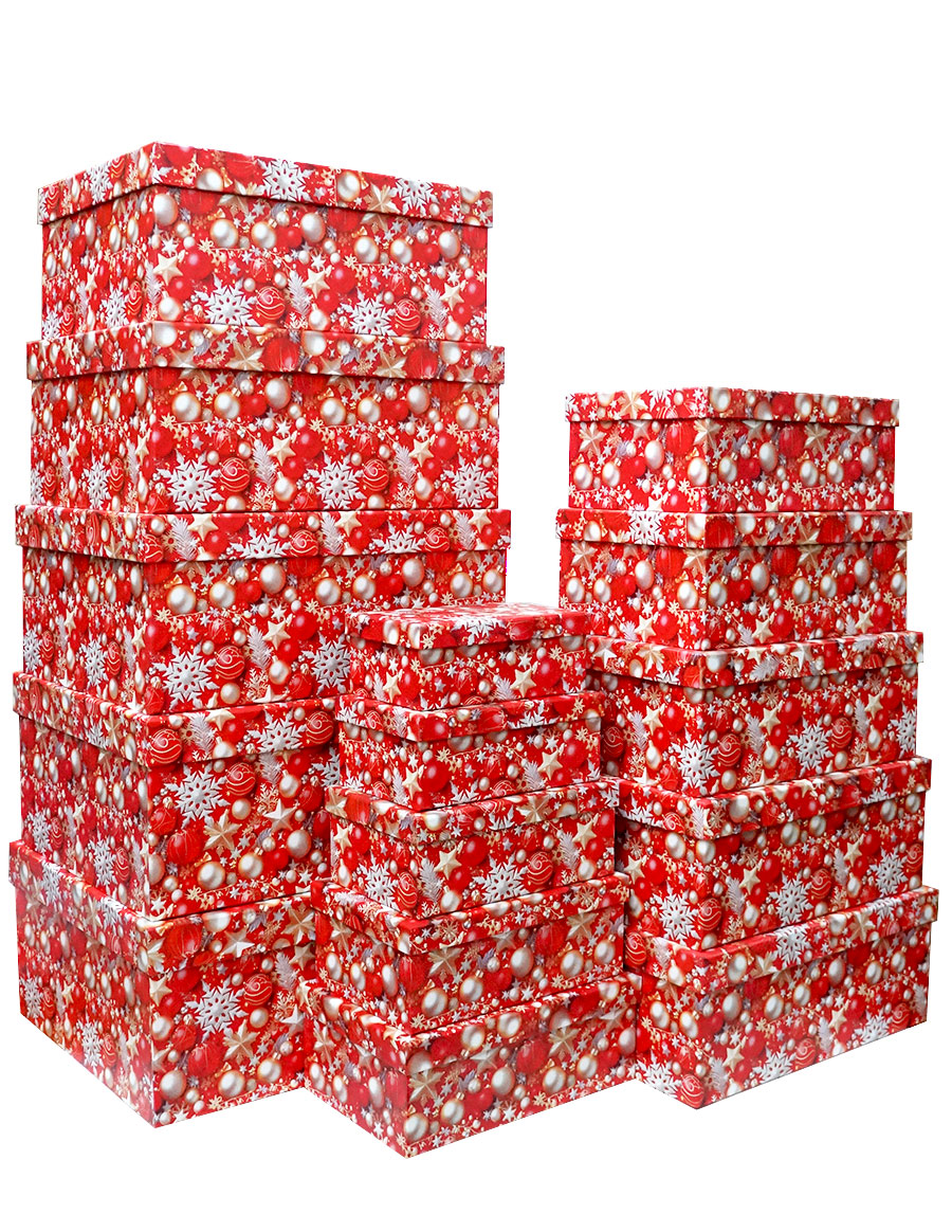Набор из пятнадцати больших прямоугольных подарочных коробок, расцветка "Красные игрушки". Коробки изготовлены из плотного картона, отделка подарочных коробок выполнена матовой бумагой с рисунком.