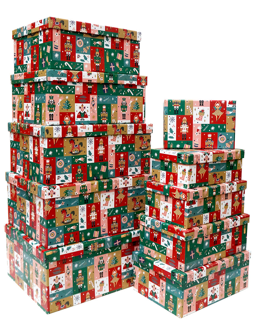 Набор из десяти новогодних прямоугольных подарочных коробок, расцветка "Щелкунчик". Коробки изготовлены из плотного картона, отделка подарочных коробок выполнена матовой бумагой с новогодним рисунком.