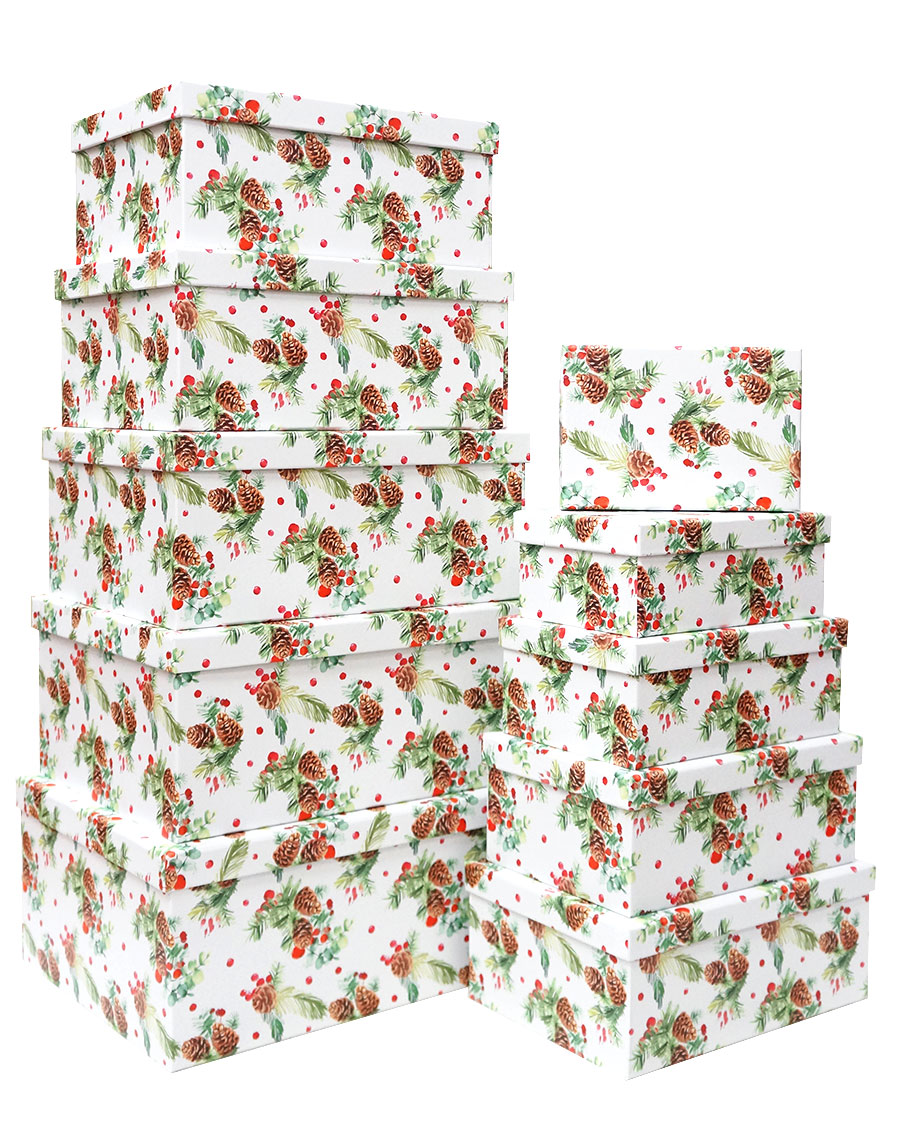 Набор из десяти новогодних прямоугольных подарочных коробок, расцветка "Шишки на белом фоне". Коробки изготовлены из плотного картона, отделка подарочных коробок выполнена матовой бумагой с новогодним рисунком.