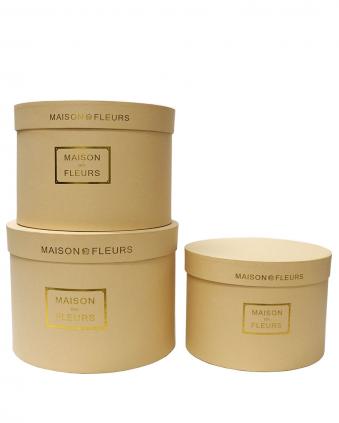 Набор из трёх шляпных подарочных коробок, цвет кремовый. Коробки изготовлены из плотного картона, отделка подарочных коробок выполнена матовой бумагой с золотым тиснением.