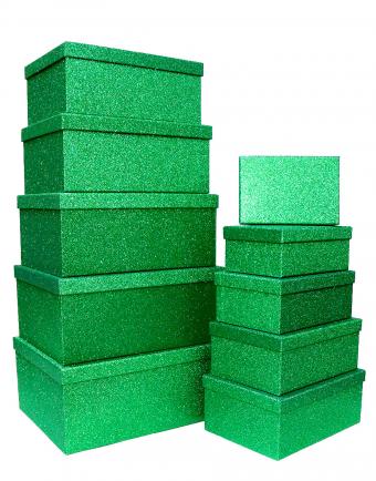 Набор из десяти блестящих прямоугольных подарочных коробок зелёного цвета. Коробки изготовлены из плотного картона, отделка подарочных коробок выполнена текстурной люксовой блестящей бумагой.