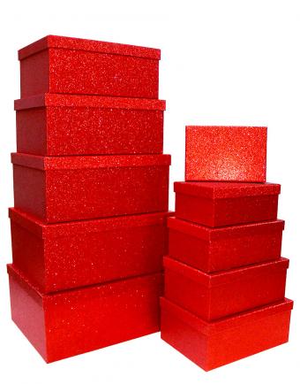 Набор из десяти блестящих прямоугольных подарочных коробок красного цвета. Коробки изготовлены из плотного картона, отделка подарочных коробок выполнена текстурной люксовой блестящей бумагой.