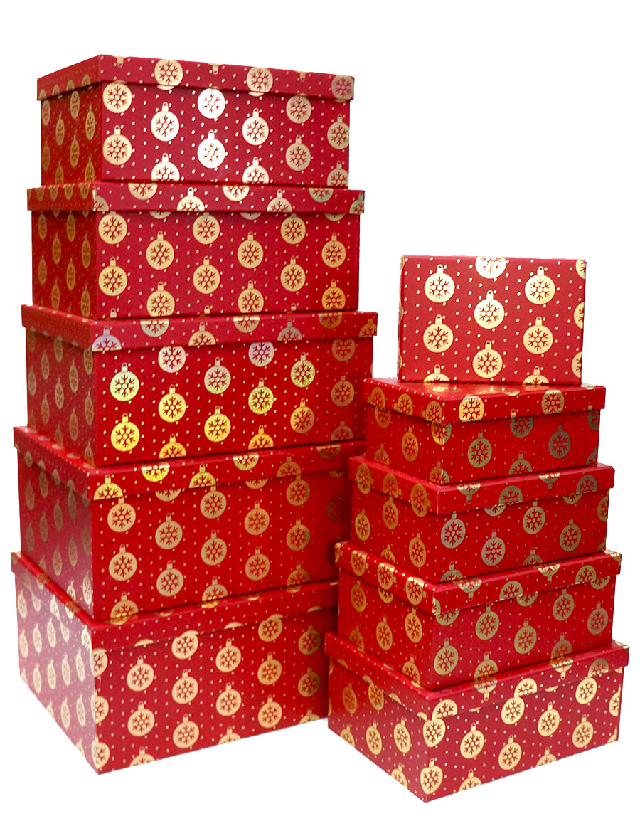 Набор из десяти прямоугольных подарочных коробок, красного цвета с тиснением. Коробки изготовлены из плотного картона, отделка подарочных коробок выполнена матовой бумагой с металлизированным тиснением "игрушки".