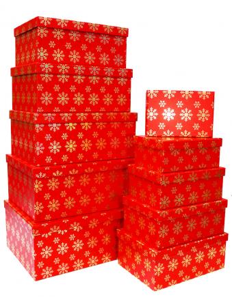 Набор из десяти новогодних прямоугольных подарочных коробок красного цвета с тиснением. Коробки изготовлены из плотного картона, отделка подарочных коробок выполнена матовой бумагой с металлизированным тиснением "Снежинки".