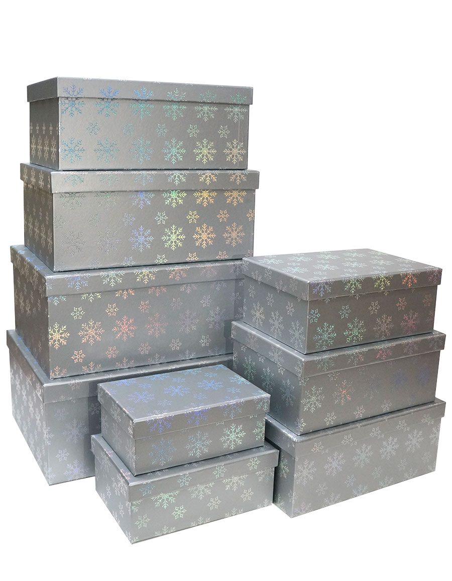 Набор из девяти новогодних прямоугольных подарочных коробок серебряного цвета, отделка матовой бумагой с тиснением "Снежинки", размер 35*27*16 см.