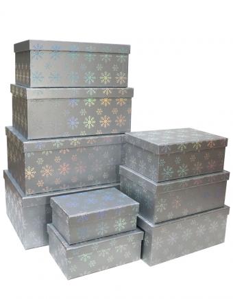 Набор из девяти новогодних прямоугольных подарочных коробок серебряного цвета с тиснением. Коробки изготовлены из плотного картона, отделка подарочных коробок выполнена матовой бумагой с металлизированным тиснением "Снежинки".