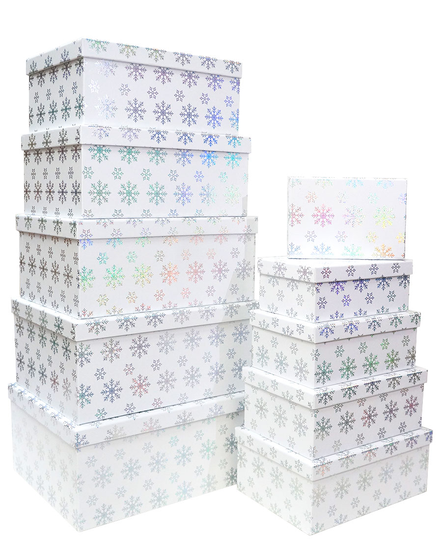 Набор из десяти новогодних прямоугольных подарочных коробок белого цвета, отделка матовой бумагой с тиснением "Снежинки", размер 37*28*17 см.