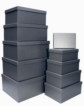 Набор из десяти однотонных прямоугольных подарочных коробок графитового цвета. Коробки изготовлены из плотного картона, отделка подарочных коробок выполнена фактурной дизайнерской люксовой матово-перламутровой бумагой.
