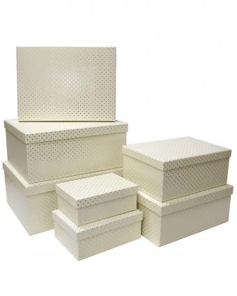 Набор из семи прямоугольных подарочных коробок молочного цвета, отделка матовой бумагой с тиснением серебряными точками, размер 35*27*16 см.