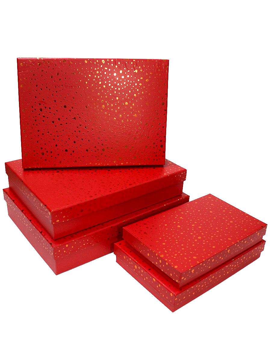 Набор из пяти плоских прямоугольных подарочных коробок, цвет красный. Коробки изготовлены из плотного картона, отделка подарочных коробок выполнена матовой бумагой с золотым тиснением.